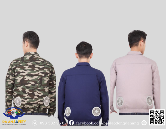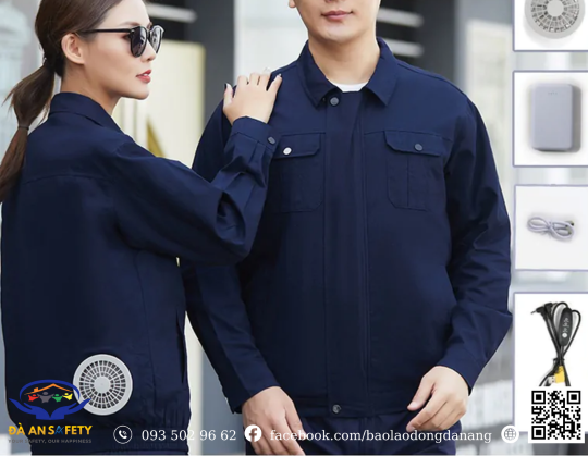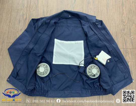 Sản phẩm bao gồm áo có sẵn lỗ gắn quạt 2 bên phía sau áo, bộ quạt đầy đủ phụ kiện (pin, dây sạc)