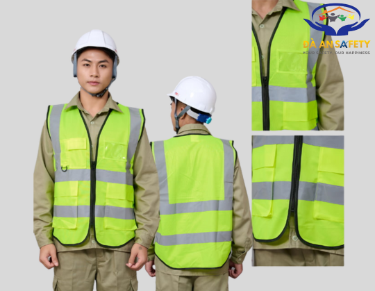 Phần phản quang được may cố định dạng hai sọc ngang quanh thân áo, kết hợp hai sọc dọc từ vai xuống tạo hình chữ “H”, giúp người mặc dễ dàng được nhận diện từ xa khi có ánh sáng chiếu vào – đặc biệt hữu ích vào ban đêm hoặc trong môi trường thiếu sáng.