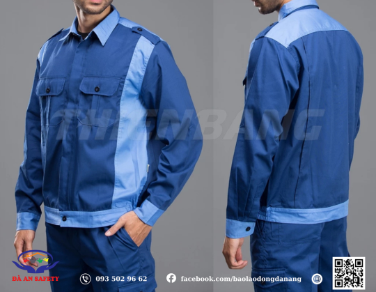 Màu sắc: Thường có màu xanh công nhân truyền thống, phối màu xanh nhạt hoặc cam ở cổ, vai, túi áo và tay áo.