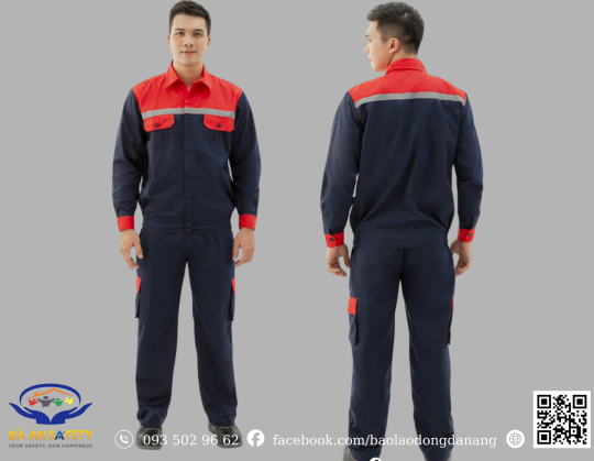 Sản phẩm sử dụng vải kaki 31 cao cấp, kết hợp phối màu tím than – đỏ nổi bật, giúp người lao động vừa an toàn, thoải mái khi làm việc, vừa mang lại hình ảnh chuyên nghiệp – đồng bộ cho doanh nghiệp.