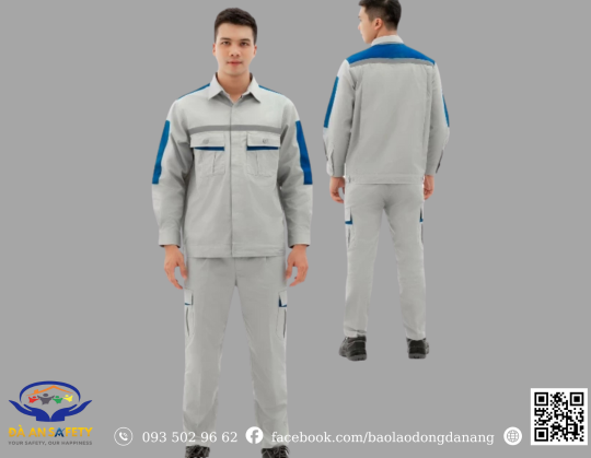 - Thiết kế hiện đại – tiện dụng: Áo phối màu ghi – xanh kèm phản quang; quần có túi hộp, chun hông co giãn, phù hợp cường độ lao động cao.
